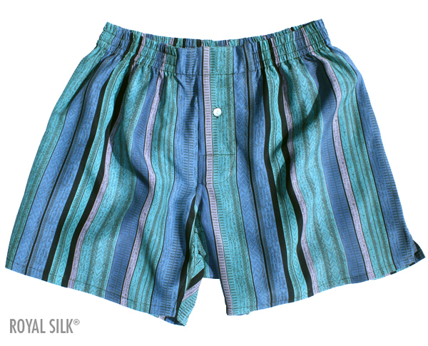 Pleasant oceanic stripes in comforting sea blues and greens with accents of slick black lines.� Styled in a high-weight of Corded Silk.� Waist sizes S (30-32"), M (33-34"), L (35-36"), XL (37-38"), and XXL (39-40").� Wash or dry clean.� We include how-to-wash instructions in simple, easy steps.� Also, we highly recommend our Washer Bag that is sold separately in two sizes.� Jade Waves, $39. SEE OTHER SILK BOXERS