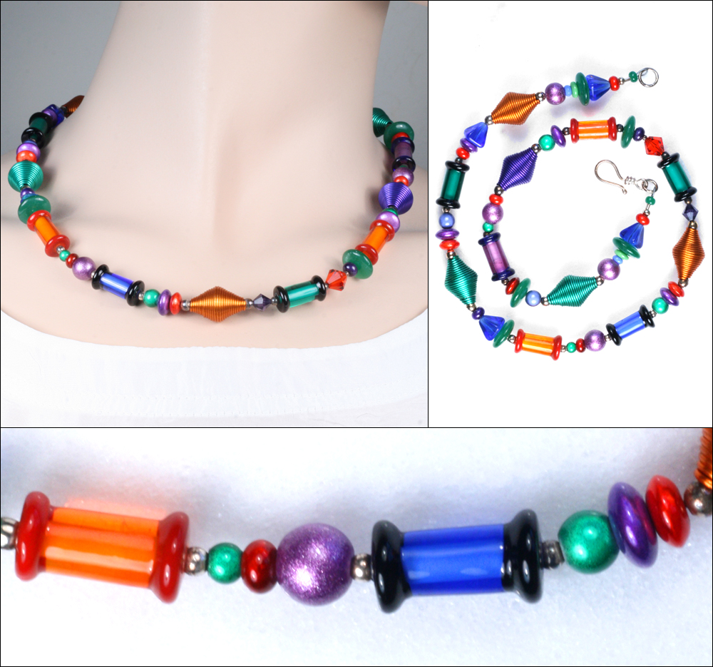 This bold, eye-catching, multi-colored, whimsical, one-of-a-kind Royal Silk necklace showcases our designer�s extensive knowledge of jewelry design, construction, and craftsmanship. Here you will find unique �spool� beads handmade by AleAle, a creative couple in the Czech Republic that is fashioning a modern look to the 1,000-year old Bohemian glass industry. Our own inventive, Princeton-based artist then juxtaposes the modernistic �spool� beads with an unusual combination of pressed glass beads, anodized aluminum bicones, mini sterling silver beads, Swarovski crystal, and glittery �miracle� beads that glow in low light. Finely finished with a handmade, sterling silver hook clasp. And the final result is a contemporary, museum-worthy jewelry collectible. Necklace 2871. Hand-fabricated in the USA. 18.5�. $125