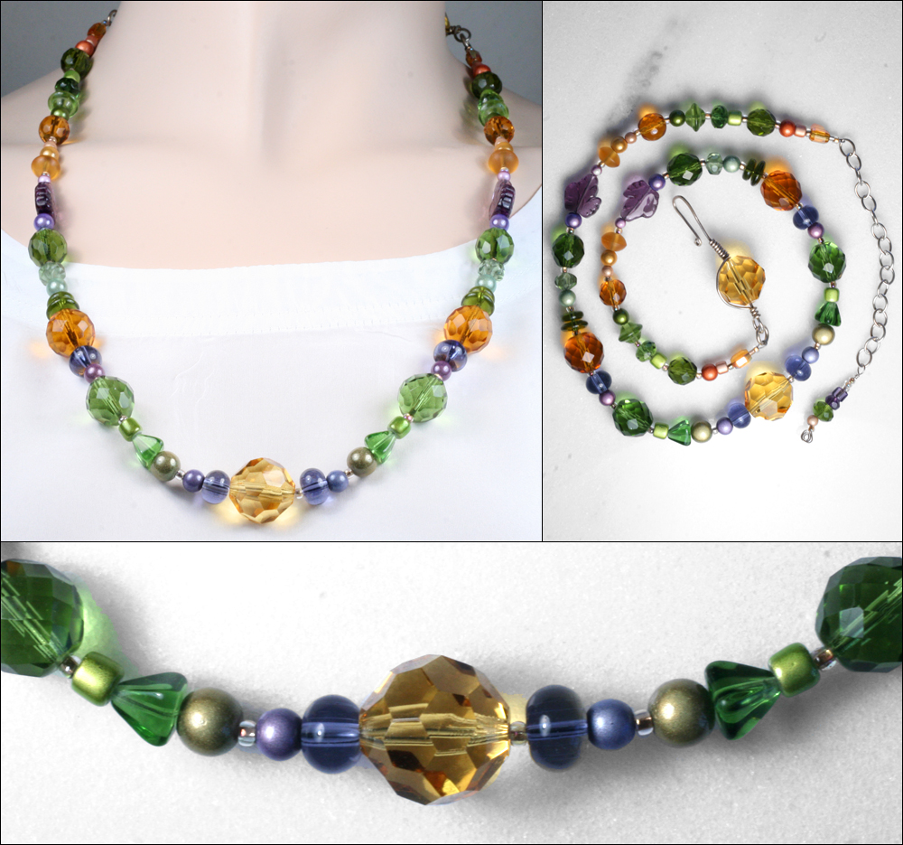 A dazzling blend of pastel jewelry elements highlight this one-of-a-kind necklace by Royal Silk. The many shapes of Czech fire-polish and pressed glass beads are intermingled with �miracle� beads that glow in low light, and deftly separated by gold-lined crystal AB (Aurora Borealis) seed beads. From her Princeton-based studio, our consummate jewelry designer and maker says, �The giant center honker was so delicious I had to make the sterling clasp include another. Sterling (silver) chain adjusts to suit your d�colletage.� Wearable art, designed and hand-fabricated in New Jersey, USA. Necklace 3053 is 21� in length with an added 4� chain. $135.