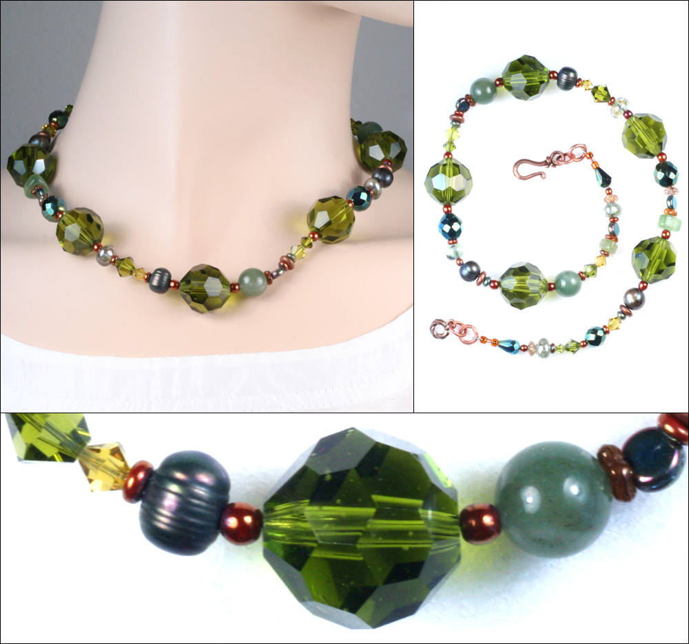 Spellbinding one-of-a-kind Royal Silk necklace that dares to explore greenery or the idea of �green� and play with its tonalities in ways only a master jeweler would think of. First there is the use of Czech, press, and fire-polish glass in metallic, iris, and lustre finishes. Then our Princeton-based artist spices this remarkable blend of jeweler�s glass with spherical elements of Swarovski crystal, green Aventurine, Jade, and freshwater pearls. And what it adds up to is nothing less than wearable art. Copper hook clasp, as shown. Hand-fabricated in the USA. Necklace 2040. 16��. $110