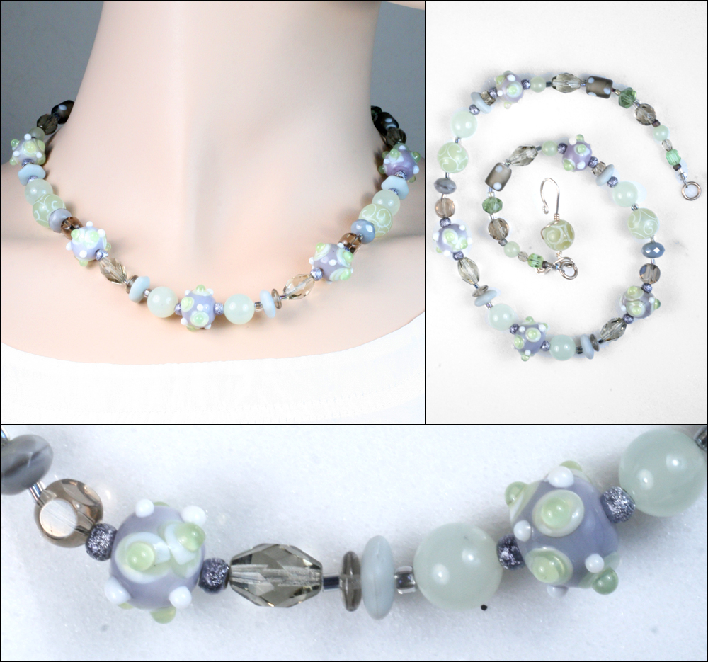 Understated dress-up glamour is the object of this chic, one-of-a-kind Royal Silk necklace. Remarkably sculpted and handmade �lampwork� glass with raised �eyes� sets the palette as it interplays with etched and other Serpentine forms, and with Czech pressed and fire-polish glass, that are in turns separated by �glitter� beads as well as hexagonal Japanese seed-beads. The other unusual and stylistic art detail is the handmade hook closure in sterling silver with captured bead. Hand-fabricated in the USA. Necklace 2775. 17��. $105