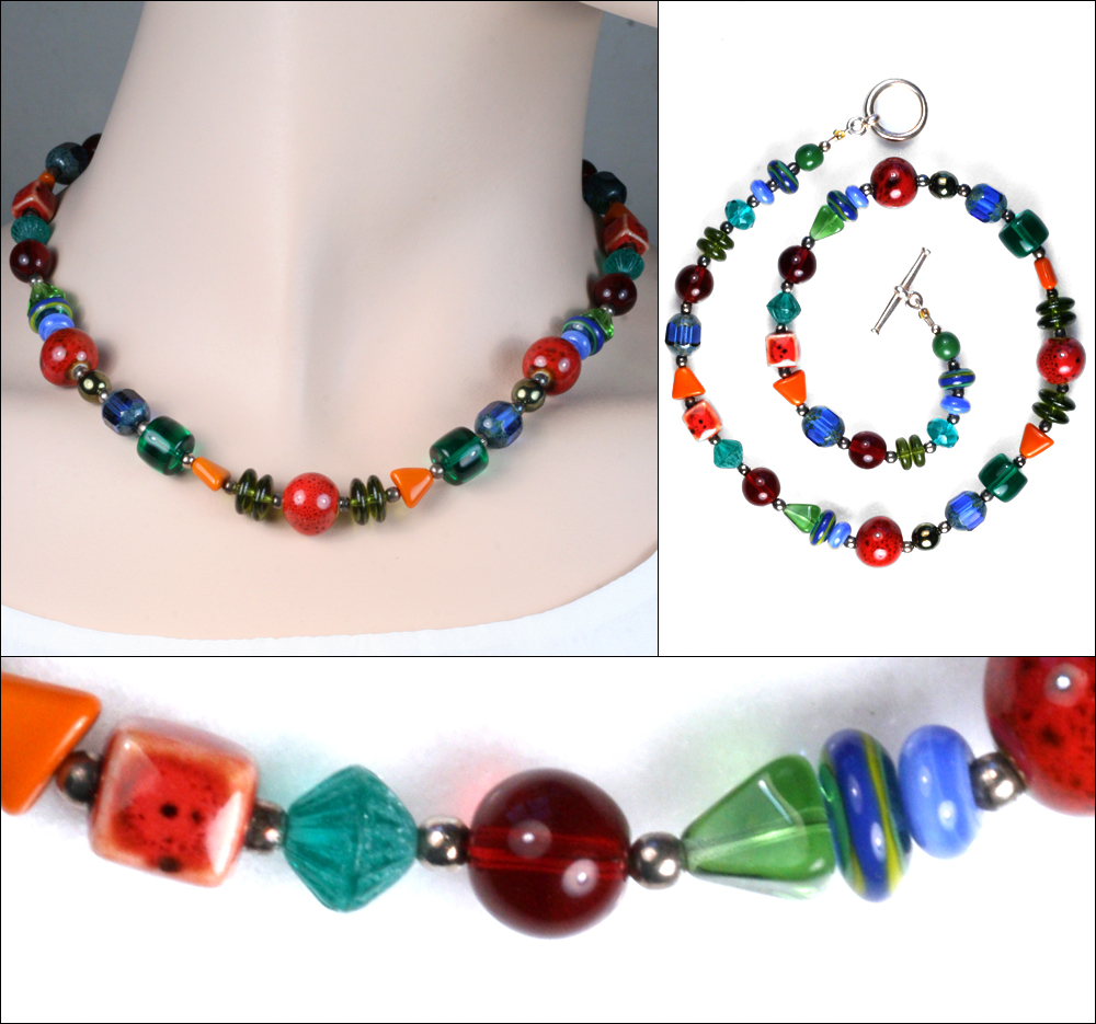 Majestic beads in rich, bold, rhythmic colors cast a spell in of magic and mystery in this one-of-a-kind Royal Silk necklace. This frisky piece of jewelry art features vintage and new glass beads from Europe and Asia, handmade Javanese rondelles, multi-colored spheres of ceramic, each separated by sterling silver rounds that make the adjacent colors pop. Sterling-plated toggle closure. Designed and hand-fabricated in the USA by our Princeton-based artist. Necklace 3122. 17�. $99