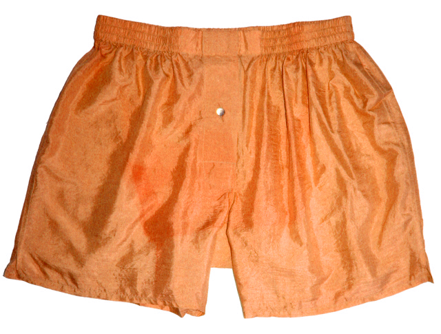 You will find these orange silk boxers to be smart, savvy, smooth and sexy. Slip on a pair and you�ll know why soft, supple silk is the most desirable form of clothing against the human skin. Sleep in them and you will know how silken comfort can feel so graceful. Simply stated � there is no other fabric like silk and that�s why only silk is silk. Fashioned in lightweight crinkled India silk by Royal Silk. Crinkling is an ancient hand-method of texturizing the silk fabric to create fine, subtle, and thin all-over lines for a unique menswear look. Imported. Hand wash or dry clean. Easy wash instructions included. And should you want to machine wash, we recommend our small Washer Bag for silks, sold separately for $7.50 each. Waist sizes: S (30-32�), M (33-34�), L (35-36�), XL (37-38�), 2XL (39-40�), and 3XL (41-42�).>>SEE OTHER SILK BOXERS