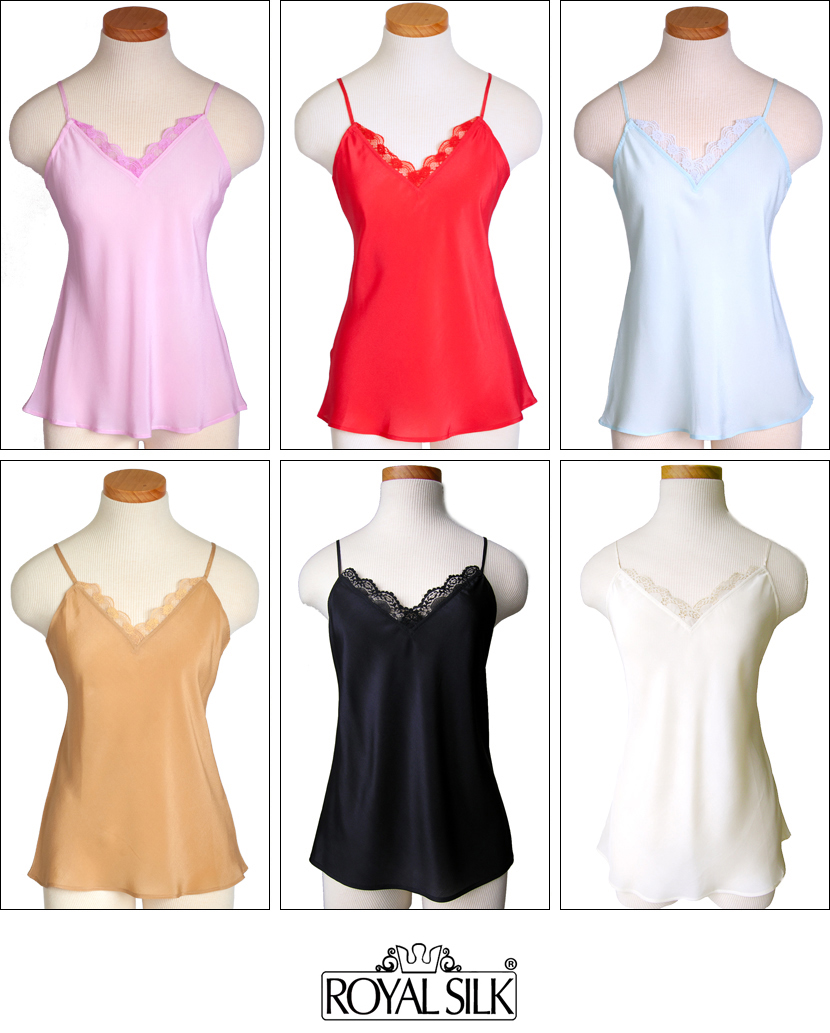 Lace-trim cami with adjustable straps in silk crepe. This durable and versatile silk camisole is lightweight and has a wonderful drape. Seduction, comfort, and class in its simplest form. Colors: Baby Pink, Fab Red, Baby Blue, Soft Brown, Black, Ivory, and Lilac. $40.