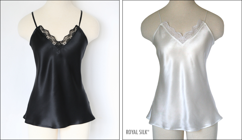 Lace-trim cami with adjustable straps in luscious satin silk. This durable and versatile silk camisole is lightweight and has a creamy sheen. Seduction, comfort, and class in its simplest form. Colors: Ivory and Black. $40.