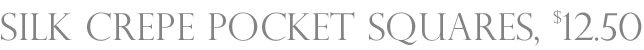 What makes Silk Crepe different from other types of silks is its smooth, handsome drape and the rich quality of color. Its luster is quiet, elegant, and stylish. What�s more is that this graceful silk will allow you to create a variety of spiffy poufs that are simply not possible with woven, textured silks. Pictures of Silk Crepe pocket squares on the Royal Silk website will give you a good idea of the debonair looks you can create. And most interestingly, magicians often use Silk Crepe scarves and handkerchiefs in their acts of illusion and conjuration. About 17� Square. Imported. Hand wash or dry clean. $12.50.