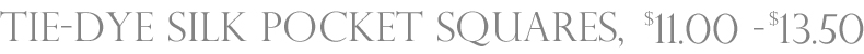 Tie-and-dye colorizing is an early textile art form of hand-applying bright, saturated dyes to wet fabrics so as to create swirling, liquefied, lava-like designs. Employing one or more colors, the hand-made designs can look either somewhat symmetrical or totally random. In either case, the resulting patterns are eye-catching, somewhat hallucinogenic, and definitely not mass-produced. Each one is slightly different. And therein lies the appeal of genuine tie-dyed fabrics. These unusual pocket squares work best with tie-less suits. Hand wash or dry clean. Full-sized, 16� by 16�. Pure silk tie-and-dye pocket squares by Royal Silk from $11 to $13.50 each.