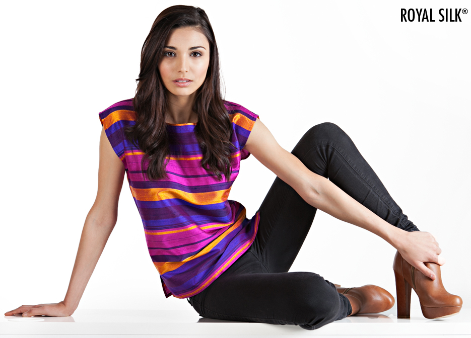If superb class, color, sheen, and impact is what you want in a silk top, you couldn�t ask for more. This classic Royal Silk shell features bright Silk Dupioni stripes in rich luminous tones of purple, indigo, orange, and fuchsia. Dupioni Silk is a heavy-weight spun silk woven with a textured finish that is more stain-resistant than other types of silk. In terms of care, it dries quickly and irons easily. Dazzling Silk Dupioni has often been the star fabric of lavish costumes in countless Broadway musicals, Hollywood movies, romance novels, and at many storied weddings. Hand wash or dry clean. Product of South India. Sizes XS, S, M, L, XL, and XXL. Siam Stripes Silk Shell, $55.